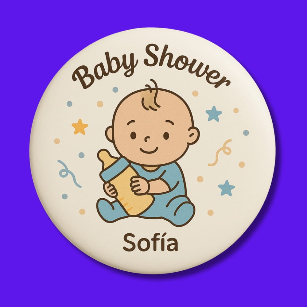 Celebra la llegada del nuevo bebé con un toque especial. Nuestras chapitas para baby shower son el recuerdo perfecto para tus invitados. Diseñadas con ternura y alegría, estas chapitas cuentan con ilustraciones adorables, nombres personalizados, frases tiernas o temáticas como niño, niña o neutral. Disponibles en varios tamaños y colores, se pueden adaptar al estilo de tu evento. Perfectas para prender en la ropa, bolsitas de regalo o decoración.